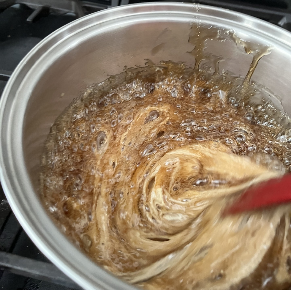 In a medium sized sauce pan (You will need room for expansion once that baking soda is stirred in) add: